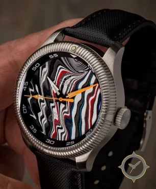 Eine Taucheruhr-Uhr mit einem markanten 43.5mm Auftritt am Handgelenk, gefertigt aus Edelstahl mit einem Zifferblatt in schwarz und einer besonderen "marbled / swirled"-Oberfläche.