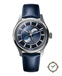 Eine Dress-Uhr mit einem vielseitigen 39mm Gehäuse, das an fast jedes Handgelenk passt, gefertigt aus Edelstahl mit einem Zifferblatt in marineblau und einer besonderen "radial guilloché center with star-speckled outer ring (sparkle effect)"-Oberfläche und einer wunderschönen Mondphasenanzeige.