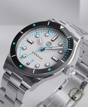 Eine Taucheruhr-Uhr mit einem 33mm Gehäuse im Vintage-Stil gefertigt aus Edelstahl mit einem Zifferblatt in weiß und einer besonderen "textured waffle / cross-hatch"-Oberfläche.