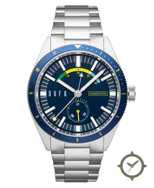 Eine Sport-Uhr mit einem markanten 43.5mm Auftritt am Handgelenk, gefertigt aus Edelstahl mit einem Zifferblatt in marineblau und einer besonderen "sunburst"-Oberfläche und einer praktischen Gangreserveanzeige.