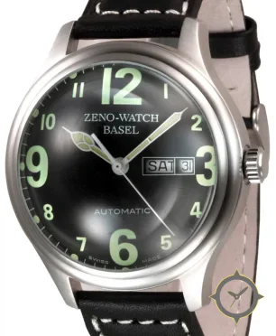 Eine Pilot-Uhr gefertigt aus Edelstahl mit einem Zifferblatt in schwarz und einer besonderen "glossy"-Oberfläche.