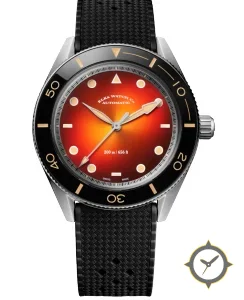 Eine Taucheruhr-Uhr mit einem 35.5mm Gehäuse im Vintage-Stil gefertigt aus Edelstahl mit einem Zifferblatt in orange und einer besonderen "sunburst"-Oberfläche.