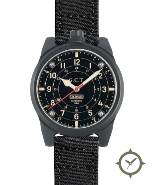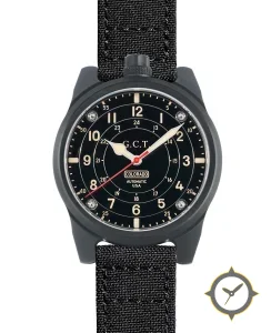 Eine Militär-Uhr mit einem markanten 41.5mm Auftritt am Handgelenk, gefertigt aus Beschichtung mit einem Zifferblatt in schwarz und einer besonderen "matte"-Oberfläche.