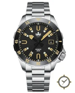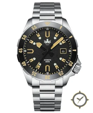 Eine Taucheruhr-Uhr mit einem vielseitigen 39.5mm Gehäuse, das an fast jedes Handgelenk passt, gefertigt aus Edelstahl mit einem Zifferblatt in schwarz und einer besonderen "textured (grained)"-Oberfläche.