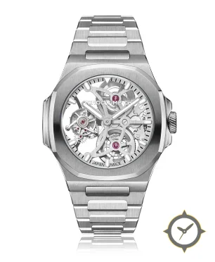 Eine Skelett-Uhr mit einem markanten 52.5mm Auftritt am Handgelenk, gefertigt aus Edelstahl mit einem Zifferblatt in silber und einer besonderen "skeletonised (open-worked)"-Oberfläche.