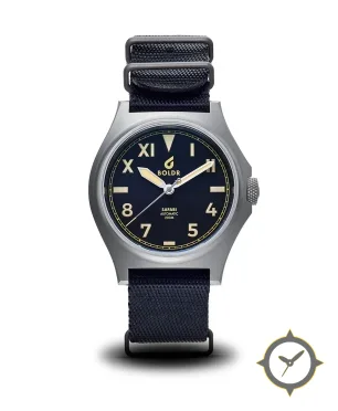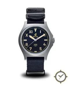 Eine Field-Uhr mit einem 33.5mm Gehäuse im Vintage-Stil gefertigt aus Edelstahl mit einem Zifferblatt in marineblau und einer besonderen "matte"-Oberfläche.