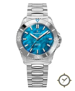 Eine Taucheruhr-Uhr mit einem markanten 49mm Auftritt am Handgelenk, gefertigt aus Edelstahl mit einem Zifferblatt in türkis und einer besonderen "mother-of-pearl"-Oberfläche.