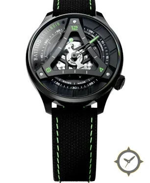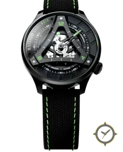 Eine Skelett-Uhr mit einem vielseitigen 39mm Gehäuse, das an fast jedes Handgelenk passt, gefertigt aus Edelstahl mit einem Zifferblatt in schwarz und einer besonderen "skeleton / open-work (visible movement)"-Oberfläche.