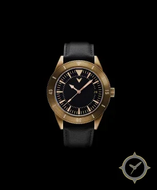 Eine Taucheruhr-Uhr mit einem vielseitigen 40.5mm Gehäuse, das an fast jedes Handgelenk passt, gefertigt aus Bronze mit einem Zifferblatt in schwarz und einer besonderen "matte"-Oberfläche.