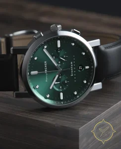 Eine Dress-Uhr mit einem 33.5mm Gehäuse im Vintage-Stil gefertigt aus Edelstahl mit einem Zifferblatt in grün und einer besonderen "sunburst"-Oberfläche.