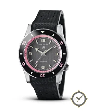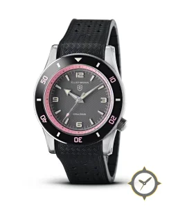 Eine Taucheruhr-Uhr gefertigt aus Edelstahl mit einem Zifferblatt in grau und einer besonderen "textured wavy pattern"-Oberfläche.