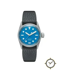 Eine Taucheruhr-Uhr mit einem vielseitigen 38.5mm Gehäuse, das an fast jedes Handgelenk passt, gefertigt aus Edelstahl mit einem Zifferblatt in blau und einer besonderen "matte"-Oberfläche.