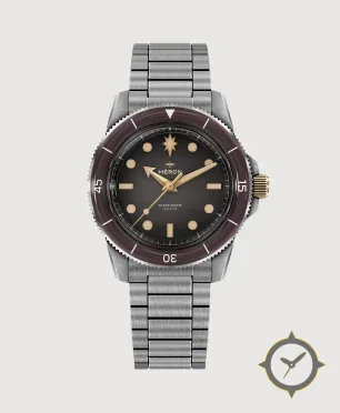 Eine Taucheruhr-Uhr mit einem vielseitigen 38mm Gehäuse, das an fast jedes Handgelenk passt, gefertigt aus Edelstahl mit einem Zifferblatt in schwarz und einer besonderen "fumé gradient"-Oberfläche.