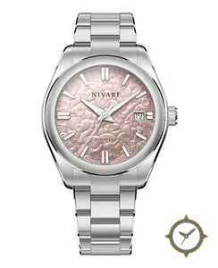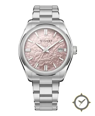Eine Dress-Uhr mit einem vielseitigen 40.5mm Gehäuse, das an fast jedes Handgelenk passt, gefertigt aus Edelstahl mit einem Zifferblatt in silber und einer besonderen "embossed floral guilloche / sunburst metallic finish"-Oberfläche.
