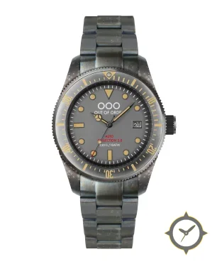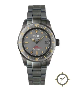 Eine Taucheruhr-Uhr mit einem vielseitigen 40mm Gehäuse, das an fast jedes Handgelenk passt, gefertigt aus Edelstahl mit einem Zifferblatt in grau und einer besonderen "matte"-Oberfläche.