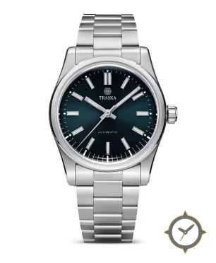 Eine Sport-Uhr mit einem vielseitigen 39.5mm Gehäuse, das an fast jedes Handgelenk passt, gefertigt aus Edelstahl mit einem Zifferblatt in blau und einer besonderen "sunburst / ombré (fume)"-Oberfläche.