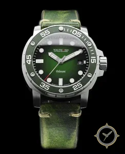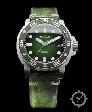 Eine Taucheruhr-Uhr mit einem markanten 43mm Auftritt am Handgelenk, gefertigt aus Edelstahl mit einem Zifferblatt in grün und einer besonderen "sunburst gradient"-Oberfläche.