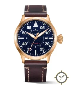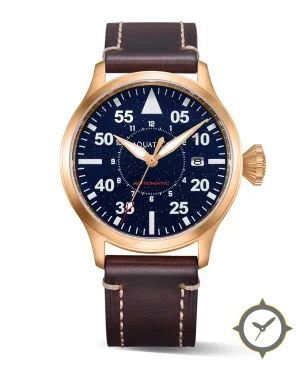 Eine Pilot-Uhr mit einem markanten 48.5mm Auftritt am Handgelenk, gefertigt aus Gold mit einem Zifferblatt in marineblau und einer besonderen "aventurine (starry)"-Oberfläche.