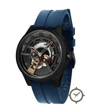 Eine Skelett-Uhr mit einem markanten 44.5mm Auftritt am Handgelenk, gefertigt aus Edelstahl mit einem Zifferblatt in schwarz und einer besonderen "ribbed/brushed surface with open-work (skeleton) cutouts"-Oberfläche.