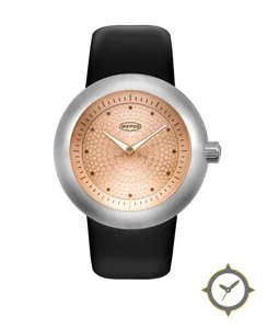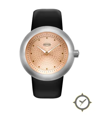 Eine Minimalistisch-Uhr mit einem markanten 44.5mm Auftritt am Handgelenk, gefertigt aus Edelstahl mit einem Zifferblatt in gold und einer besonderen "textured honeycomb / dimpled pattern"-Oberfläche.