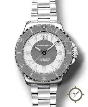 Eine Taucheruhr-Uhr mit einem markanten 48.5mm Auftritt am Handgelenk, gefertigt aus Edelstahl mit einem Zifferblatt in weiß und einer besonderen "matte"-Oberfläche.