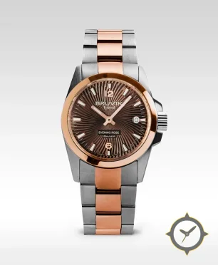 Eine Dress-Uhr mit einem vielseitigen 38.5mm Gehäuse, das an fast jedes Handgelenk passt, gefertigt aus Edelstahl mit einem Zifferblatt in braun und einer besonderen "radiating sunburst / guilloché"-Oberfläche.