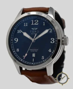 Eine Pilot-Uhr mit einem 34.5mm Gehäuse im Vintage-Stil gefertigt aus Edelstahl mit einem Zifferblatt in blau und einer besonderen "sunburst"-Oberfläche.