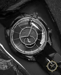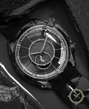 Eine Dress-Uhr mit einem markanten 44.5mm Auftritt am Handgelenk, gefertigt aus Edelstahl mit einem Zifferblatt in schwarz und einer besonderen "wavy guilloché (textured center with smooth outer ring)"-Oberfläche.