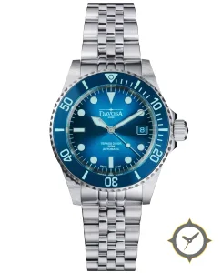 Eine Taucheruhr-Uhr mit einem markanten 49mm Auftritt am Handgelenk, gefertigt aus Edelstahl mit einem Zifferblatt in blau und einer besonderen "sunburst"-Oberfläche.