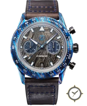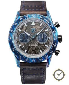 Eine Chronograph-Uhr mit einem markanten 47.5mm Auftritt am Handgelenk, gefertigt aus Edelstahl mit einem Zifferblatt in schwarz und einer besonderen "meteorite-style textured finish with etched cross-hatch lines"-Oberfläche.