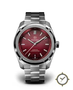 Eine Luxus-Uhr mit einem vielseitigen 40mm Gehäuse, das an fast jedes Handgelenk passt, gefertigt aus Edelstahl mit einem Zifferblatt in rot und einer besonderen "horizontal brushed finish"-Oberfläche.