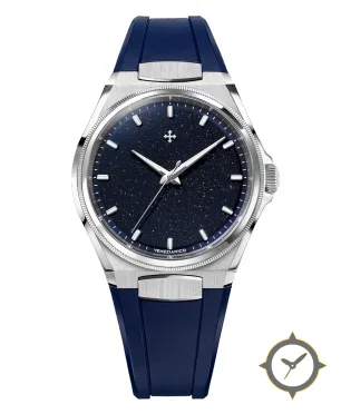 Eine Luxus-Uhr mit einem markanten 50mm Auftritt am Handgelenk, gefertigt aus Edelstahl mit einem Zifferblatt in marineblau und einer besonderen "aventurine (sparkling starfield)"-Oberfläche.