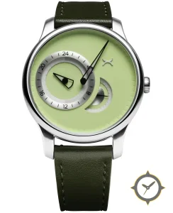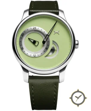 Eine Minimalistisch-Uhr mit einem markanten 47.5mm Auftritt am Handgelenk, gefertigt aus Edelstahl mit einem Zifferblatt in grün und einer besonderen "matte"-Oberfläche.