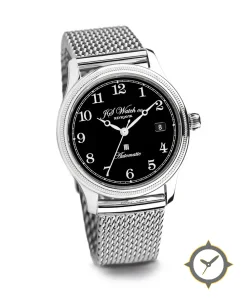 Eine Dress-Uhr mit einem markanten 42mm Auftritt am Handgelenk, gefertigt aus Edelstahl mit einem Zifferblatt in schwarz und einer besonderen "smooth lacquer"-Oberfläche.