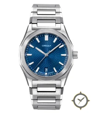 Eine Sport-Uhr mit einem vielseitigen 38mm Gehäuse, das an fast jedes Handgelenk passt, gefertigt aus Edelstahl mit einem Zifferblatt in blau und einer besonderen "concentric basket-weave guilloché (textured)"-Oberfläche und einer echten GMT-Funktion, mit der du eine zweite Zeitzone verfolgen kannst.