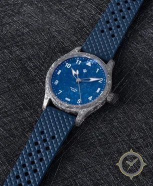 Eine Pilot-Uhr mit einem markanten 42.5mm Auftritt am Handgelenk, gefertigt aus Edelstahl mit einem Zifferblatt in blau und einer besonderen "marbled/flake textured finish"-Oberfläche.