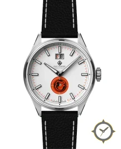 Eine Minimalistisch-Uhr mit einem markanten 46.5mm Auftritt am Handgelenk, gefertigt aus Edelstahl mit einem Zifferblatt in weiß und einer besonderen "smooth lacquer"-Oberfläche.