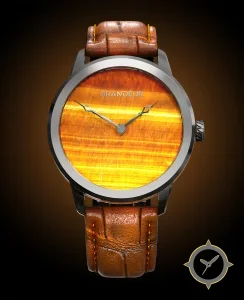 Eine Dress-Uhr mit einem markanten 48mm Auftritt am Handgelenk, gefertigt aus Edelstahl mit einem Zifferblatt in orange und einer besonderen "woodgrain / tiger-eye"-Oberfläche.