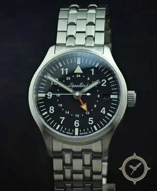 Eine GMT-Uhr mit einem 36mm Gehäuse im Vintage-Stil gefertigt aus Edelstahl mit einem Zifferblatt in schwarz und einer besonderen "matte"-Oberfläche und einer echten GMT-Funktion, mit der du eine zweite Zeitzone verfolgen kannst.