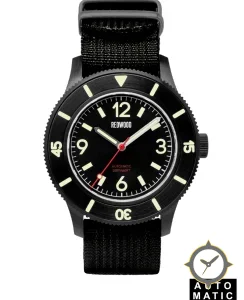 Eine Taucheruhr-Uhr mit einem vielseitigen 38mm Gehäuse, das an fast jedes Handgelenk passt, gefertigt aus Beschichtung mit einem Zifferblatt in schwarz und einer besonderen "matte"-Oberfläche.