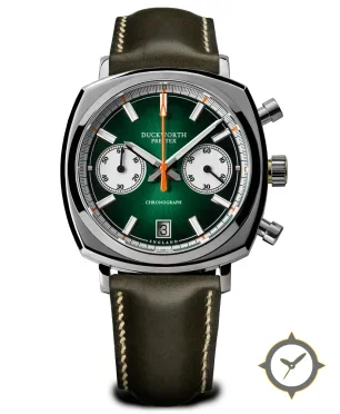 Eine Chronograph-Uhr mit einem vielseitigen 40mm Gehäuse, das an fast jedes Handgelenk passt, gefertigt aus Edelstahl mit einem Zifferblatt in grün und einer besonderen "sunburst (fumé)"-Oberfläche.