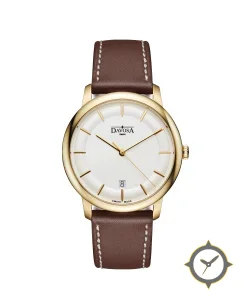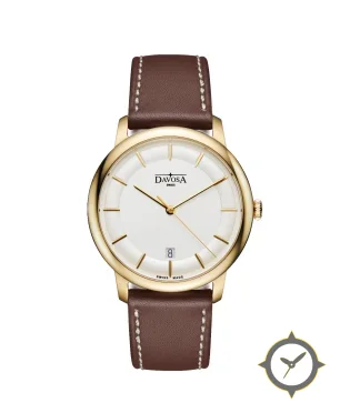 Eine Dress-Uhr mit einem 33mm Gehäuse im Vintage-Stil gefertigt aus Gold mit einem Zifferblatt in weiß und einer besonderen "matte"-Oberfläche.