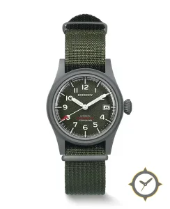 Eine Field-Uhr mit einem markanten 42.5mm Auftritt am Handgelenk, gefertigt aus Titan mit einem Zifferblatt in grün und einer besonderen "grained/matte texture"-Oberfläche.
