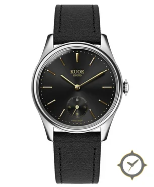 Eine Dress-Uhr mit einem 33.5mm Gehäuse im Vintage-Stil gefertigt aus Edelstahl mit einem Zifferblatt in schwarz und einer besonderen "sunburst"-Oberfläche.