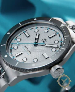 Eine Taucheruhr-Uhr mit einem vielseitigen 41mm Gehäuse, das an fast jedes Handgelenk passt, gefertigt aus Edelstahl mit einem Zifferblatt in weiß und einer besonderen "cross-hatch / textured (diamond pattern)"-Oberfläche.