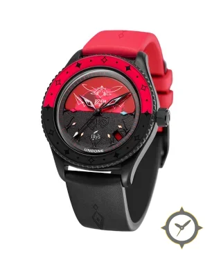 Eine Sport-Uhr mit einem markanten 43.5mm Auftritt am Handgelenk, gefertigt aus Edelstahl mit einem Zifferblatt in rot und einer besonderen "textured/grain (two-tone: upper glossy red, lower matte textured black)"-Oberfläche.