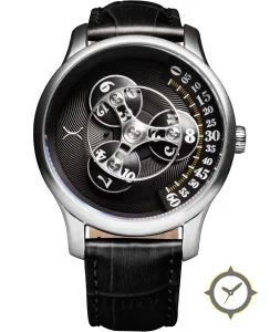 Eine Skelett-Uhr mit einem markanten 47.5mm Auftritt am Handgelenk, gefertigt aus Edelstahl mit einem Zifferblatt in schwarz und einer besonderen "concentric guilloché / spiral texture"-Oberfläche.