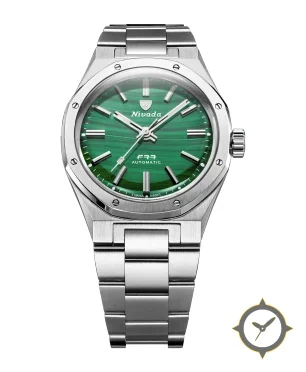 Eine Sport-Uhr mit einem 33mm Gehäuse im Vintage-Stil gefertigt aus Edelstahl mit einem Zifferblatt in grün und einer besonderen "malachite/striated"-Oberfläche.