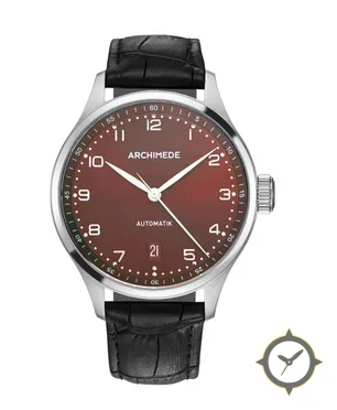 Eine Dress-Uhr mit einem markanten 45mm Auftritt am Handgelenk, gefertigt aus Edelstahl mit einem Zifferblatt in braun und einer besonderen "matte"-Oberfläche.
