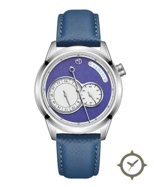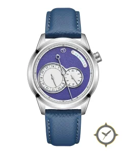 Eine Dress-Uhr mit einem markanten 42mm Auftritt am Handgelenk, gefertigt aus Edelstahl mit einem Zifferblatt in blau und einer besonderen "grained / sandblasted texture"-Oberfläche.